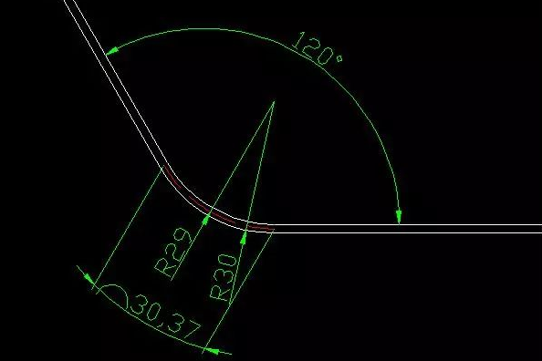 以板厚2mm,折彎角度120度,折彎外部半徑30,中性層半徑29,圓弧折彎我們算展開取中性層的弧長。所以算折彎刀數(shù)及每刀折彎角度也按中性層弧長算中性層距邊的距離為板厚的一半。