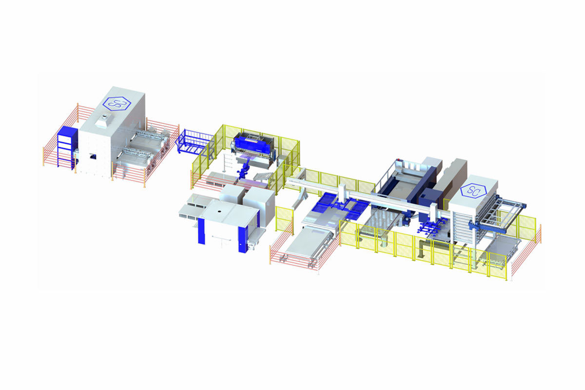 全自動立體智能鈑金料庫+單梁桁架+激光切割+自動去毛刺機+機器人自動折彎+機器人自動拼裝焊接